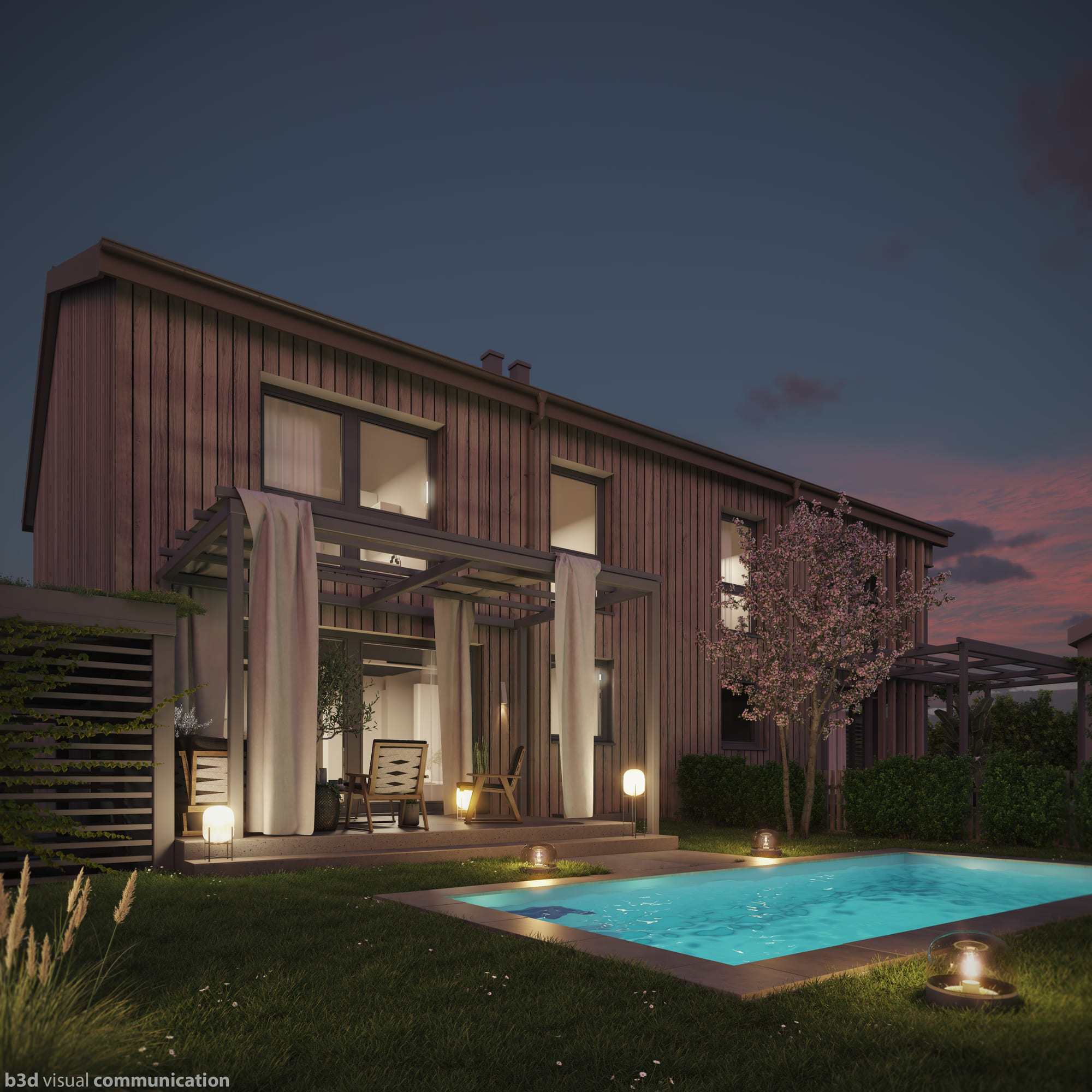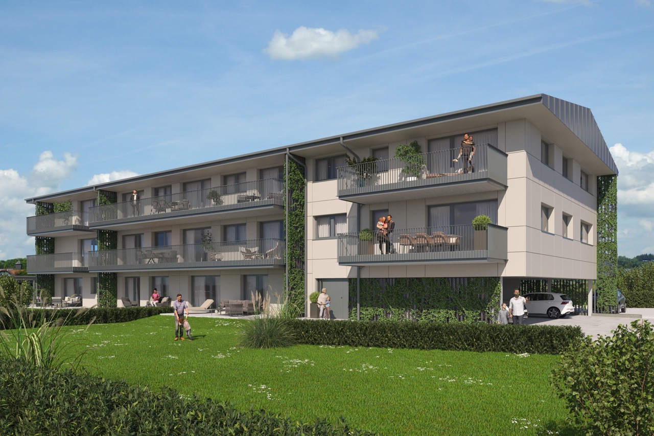 Auf rund 2.000 m² entstehen zwei Doppelhäuser und ein Mehrparteienhaus mit vier Garten- und Terrassenwohnungen. Jede Einheit verfügt über zwei Stellplätze, größtenteils als Carports. Eine große PV-Anlage und eine Wärmepumpe sorgen für nachhaltige Energieversorgung.